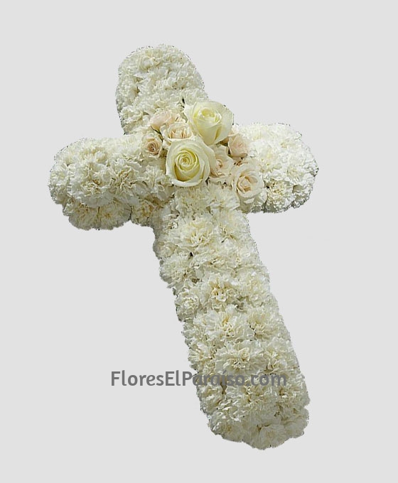 Fino y elegantes es esta Cruz Funeraria Clavel Blanco, realizado con flores para tanatorio, Esta bonita cruz de defunciones, está decorado con claveles y rosas. Es una cruz de flores clásicas blancas para tanatorio, especialmente elegante y bonita. Nos indica el amor que se siente hacia la persona querida fallecida.