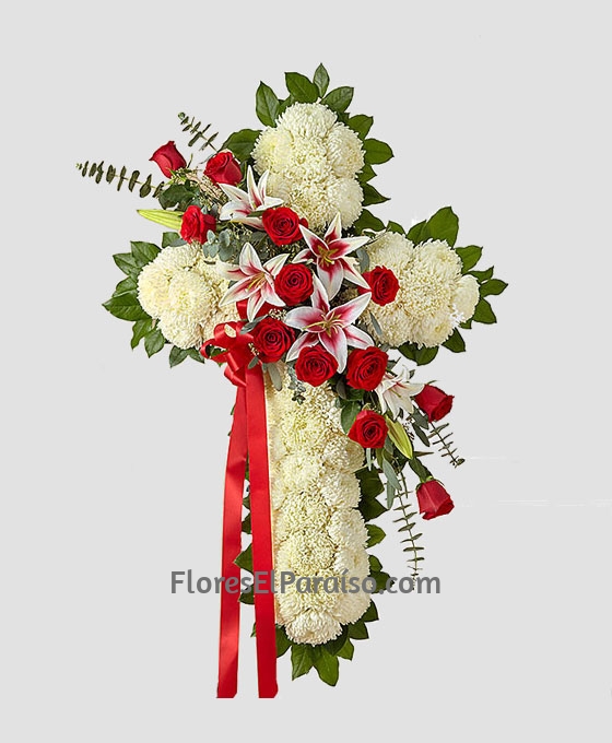 Bonita Cruz Funeraria de Clavel con rosas, realizado con flores para tanatorio, Esta bonita cruz de flores fúnebres, está decorado con crisantemos y rosas. Es una cruz de flores fúnebres, especialmente elegante y bonita. Nos indica el amor que se siente hacia la persona querida fallecida. Además, gracias al servicio de envío de flores a tanatorio, podrás recibir esta cruz de defunción en el momento indicado y acompañar el sentimiento de la familia del difunto.