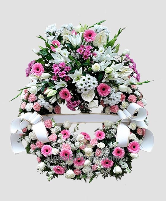 Esta preciosa Corona Funeraria Selecta, confeccionada con un aro de 70-80 cm, de flor variada de gerberas, rosas, paniculata, claveles y salpicada por verdes silvestres. Adornada en su parte superior por un cabezal. El mismo está copuesto por lilium, rosas, anthurium, margaritas, paniculata, gladiolos y verdes variados y silvestres (16 gerberas, 18 rosas, 3 anthuriums, 6 liliums, 8 varas de margaritas, paniculata, 60 claveles, verdes variados y cinta funeraria). Somos expertos floristas, realizamos siempre las coronas funerarias con flores para defunción de primera calidad. Son flores frescas. Suministradas por los mejores proveedores, nacionales e internacionales. Por lo cual nuestra corona de flores para difuntos es de una calidad excelente. Además, con el servicio de envíos florales al tanatorio, tus arreglos florales fúnebres llegarán a tiempo.
