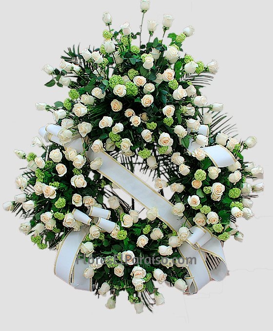 Espectacular Corona Premium Rosas Blancas para difuntos. Esta elegante corona de rosas blancas para difuntos, está realizada con cuatro cabezales de rosas blancas, entorno a unas 150 rosas. Decorada con preciosos verdes como el viburnum verde, robelini y hojas tropicales. Todo ello le da una elegancia especial. Si nuestros clientes lo solicitan podemos cambiar el color de las rosas. El color de las rosas es especial para cada persona. Las rosas de esta corona de rosas blancas para difunto de son de primera calidad. Son rosas suministradas por nuestros proveedores nacionales e internacionales de siempre. Y está confeccionada por nosotros, floristas profesionales, especialistas en el sector funerario de flores. Así que esta Corona para tanatorio será siempre especial. Además, si quiere enviar flores al tanatorio, ofrecemos un servicio de envío urgente.