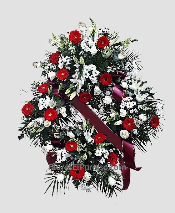 Bonita Corona Supreme Flor Variada, para Difuntos elaborada con flor variada. Compuesta por cuatro cabezales. El tipo de flor que lleva esta corona es lililum, rosas, gerberas, lisianthums, margaritas, antirrhinum, salpicada de verdes tropicales, que une los cuatro cabezales (Aro de 80 cm., con 4 cabezales, 16 gerberas, 12 varas de margaritas, 8 Delphinium, 5 varas de lilium, 15 varas de solidago, 10 lisianthums, 20 rosas de tallo corto, verdes variados y cinta funeraria). Esta corona para entregar en el tanatorio está realizada con flores de primera calidad. Son siempre frescas, y están suministradas por nuestros proveedores nacionales e internacionales. Por ello nuestros trabajos son siempre elegantes y de una calidad sublime y especial. Somos floristas profesionales, especialistas en los Arreglos Florales Fúnebres, por lo que nuestros trabajos son siempre de una calidad excepcional. Además, si quiere enviar flores al tanatorio, tiene esta corona para entregar en el tanatorio.