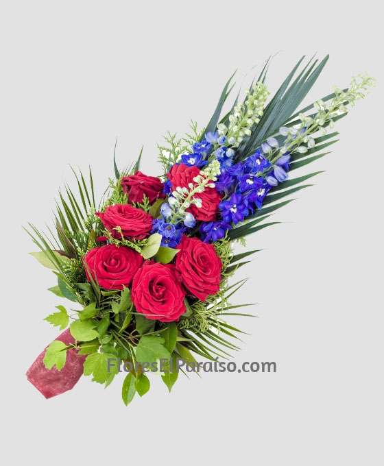 Muy elegante, este Ramo Funerario 6 Rosas Rojas. Es un ramo de defunción, de rosas de color rojo, confeccionado con 6 rosas, 2 delphinium, verdes variados, celofán, lazo y cinta funeraria. Todo este conjunto le da un aire sobrio y muy elegante a este bonito ramo de funeral.